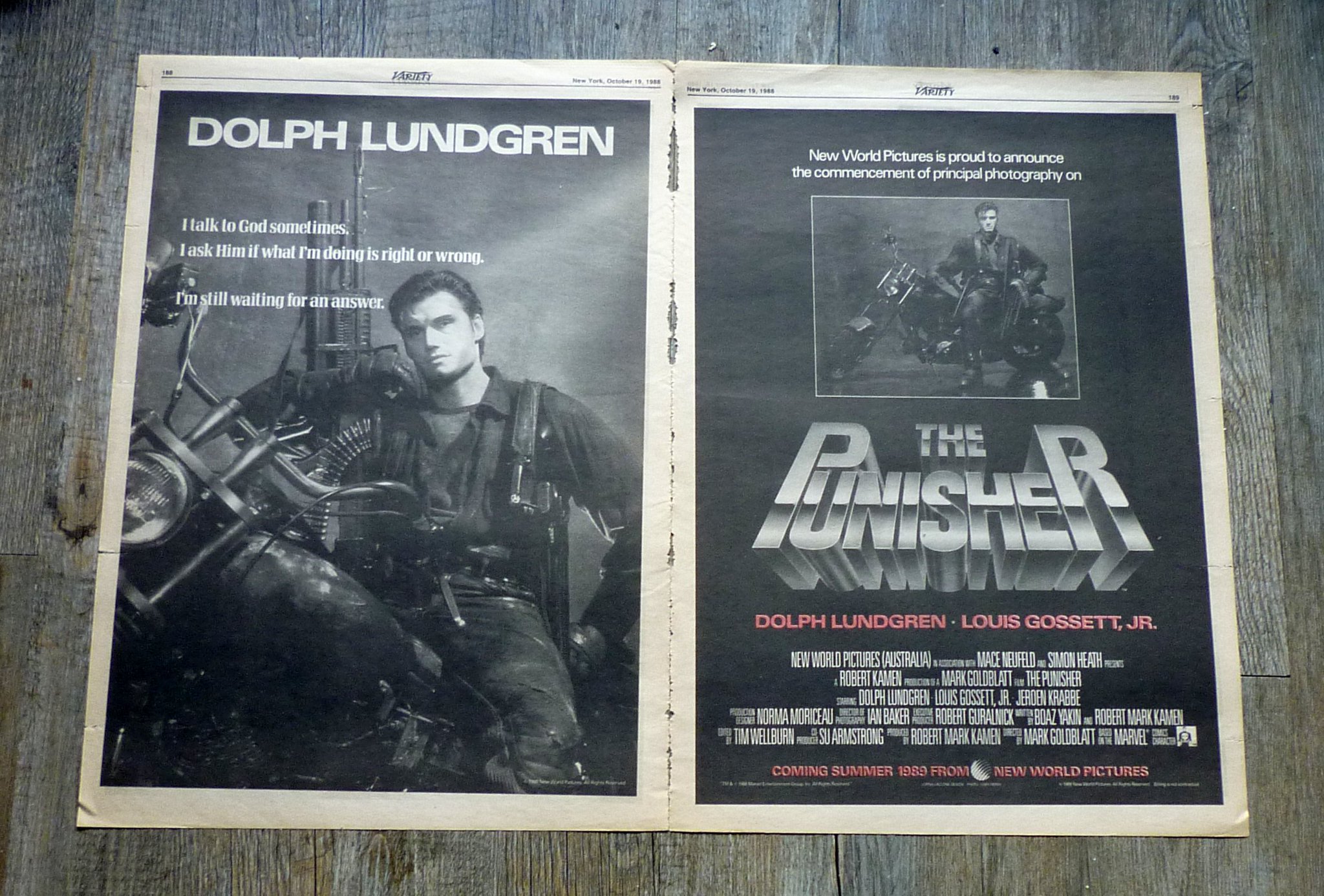 30 years ago at the defunct MIFED (Milan Film Market) of 1988, a double-page advert in Variety for the distribution pre-sales of THE PUNISHER, while filming was about to wrap at the end of that month. (personal collection)